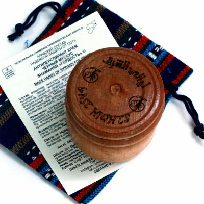 Состав эмульсия плоды оливы сирийского сорта Абу-Сатл (Olea europaea), черный животный мускус, хлопчатник мохнатый соцветия (Gossypium hirsutum), броколли семена (Brassica sylvestris), шалфей белый соцветия (Salvia apiana), воск пчелиный неотбеленный (Apis Mellifera), иллирийская смола (каменное масло), алунит природные квасцы (Alumen aluminpotassium), копал белый смола (Humenaea courbaril)