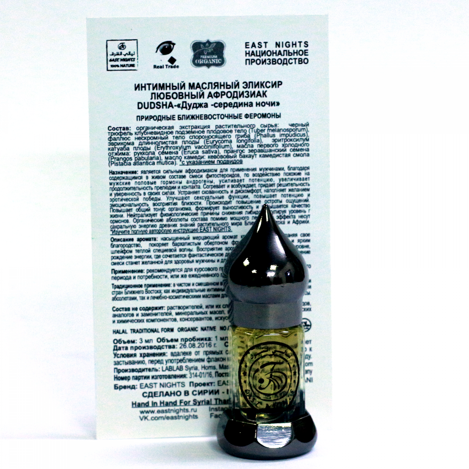 Интимный масляный элексир DUDSHA «Середина ночи» является сильным мужским афродизиаком, благодаря содержащимся в живом составе смеси фитостероидов, по воздействию похожих на мужские половые гормоны андрогены.