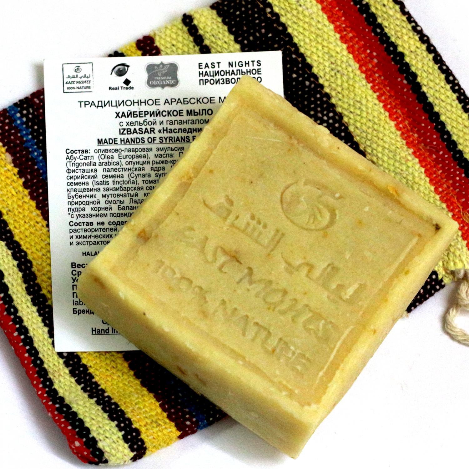 Состав эмульсия плодов оливы сирийского сорта Абу-Сатл (Olea Europaea) и лавра (Laurus Nobilis), масла: пажитник арабский семена, опунция рыже-красная семена, фисташка палестинская ядра, артишок сирийский семена, вайда красильная семена, томат семена, клещевина занзибарская семена, гидролат бубенчик мутовчатый корни, пудра природной смолы ладана аббисинского, пудра корней баланитеса египетского