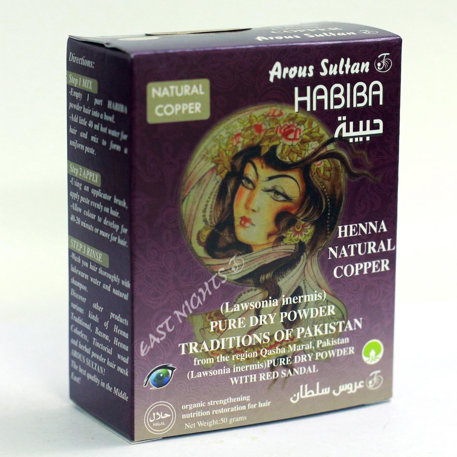 Натуральная хна для волос с медным оттенком Habiba окрашивает волосы в глубокий цвет меди. Великолепный яркий оттенок сделает ваш образ незабываемым! Традиционная медная пакистанская хна для волос с пудрой древесины Красного сандала раскроет все великолепие восточного метода окрашивания и ухода за волосами. Хна пакистанская Habiba применяется для придания волосам яркого и насыщенного стойкого оттенка, а также в лечебных и профилактических целях в домашних условиях и в салонах с красоты с преобладанием натуральных видов уходов. Эта хна применяется также для предотвращения выпадения волос, укрепления волос, питания луковиц волос.